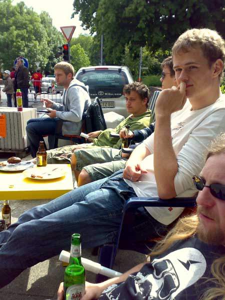 dieses Wochenende waren wieder die Matjestage in Emden. Ich würde sagen eines der wenigen großen Ereignisse, die diese Kleinststadt zu Gesicht bekommt. Aber dieses Jahr war wirklich wieder toll. Ab 15.00 fing alles an, hier haben wir uns an der FE getroffen, zum Grillen und natürlich zum Anfeuern. Die Läufer sind direkt bei Moritz, Christoph und Nobbi am Haus vorbei gelaufen, und deswegen konnten Kai, Eike, Tobi und ich uns schön zu den anderen an die Straße setzen und natürlich während des Essens den verschwitzten Läufern zugucken, wie diese sich abgehätzt haben 😉 Dazu hatten wir auch noch super Wetter. Was will man mehr? Janina mit ihrer WG, Steffi, Katrin und Steffen, waren diejenigen, die mitgelaufen sind und natürlich auch ihre Runden erfolgreich beendet haben.