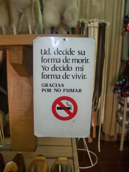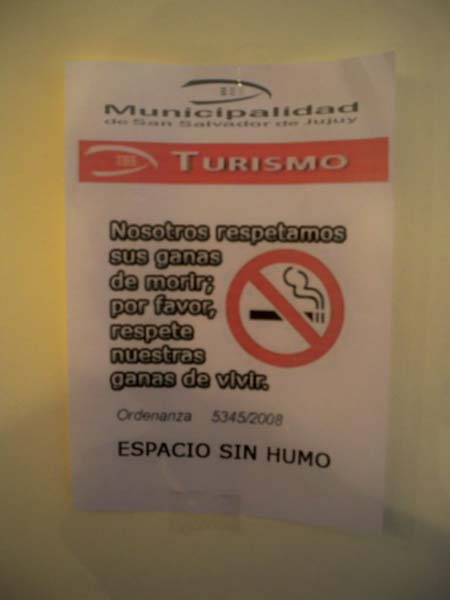 Rauchen scheint auch in Argentinien out zu werden. Auf dem Schild steht: Wir respektieren dein Verlangen zu sterben, dann respektiere unseren Wunsch zu leben. – Raum ohne Qualm
