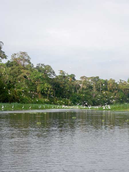 Wir waren 4 Tage im Regenwald und jeden Tag etwa der gleiche Ablauf. Am ersten Tag sind wir mit dem Boot hingefahren, haben auf dem Boot gegessen, haben uns die Zimmer angeguckt und das Gepäck reingetragen, Verhaltensregeln & Sicherheitsmaßnahmen geklärt und sind dann auf eine Tour durch den Wald gegangen. Danach gab es Abendbort (unteranderem Korkodil), mit dem Arzt und unserem Guide um Fragen zur Tour und dem Aufenthalt zu klären und anschließend sind wir zur Nachtfahrt im Kanu aufgebrochen (Kaimane beobachten und fangen).