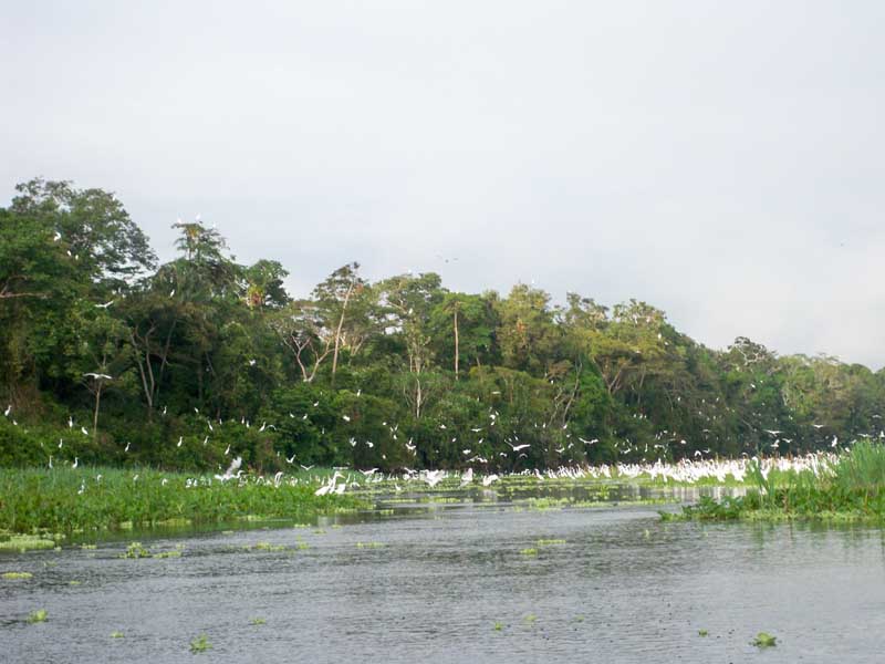 Am zweiten Tag sind wir dann um 6.00 aufgestanden um Vögel beim Frühstück zu beobachten: wir sind wieder mit dem Kanu los und es hat sich gelohnt… unglaublich viele Vögel und wahnsinnig schön. Dann haben wir selbst gefrühstückt und sind zur nächsten längeren Tour etwas tiefer in den Regenwalt gegangen. Hier haben wir fast alles gemacht… Larven gegessen, Termiten in unseren Händen verrieben um uns vor Moskitos zu schützen, haben riesen Käfer gefunden, aus Bäumen getrunken und so weiter. Wieder zurück gab es Mittagessen und einen Besucheer. Unterunserem Essraum hatte sich eine Schlange versteckt die unter Umständen tödlich sein kann. (Diese gleiche Art hat mal ein Mädchen aus dem Nachbardorf angegriffen, der daraufhin das Bein amputiert werden musste). Nach der Schlangenkunde ging es dann aber erstmal auf die nächste Bootstour. Wir sind wieder über einen Seitenarm an dem wir uns eine Lotusblüte angesehen haben, zum Amazonas gefahren um mit Delfinen zu schwimmen. Zwar konnten wir diese nicht anfassen, aber die sind nur wenige Meter neben uns geschwommen und gesprungen. Dann sind wir wieder zwei einhalb Stunden zurück gefahren, haben gegen 21.00 Abendbrot gegessen und sind nach einem sehr anstrengendem Tag ins Bett gefallen.