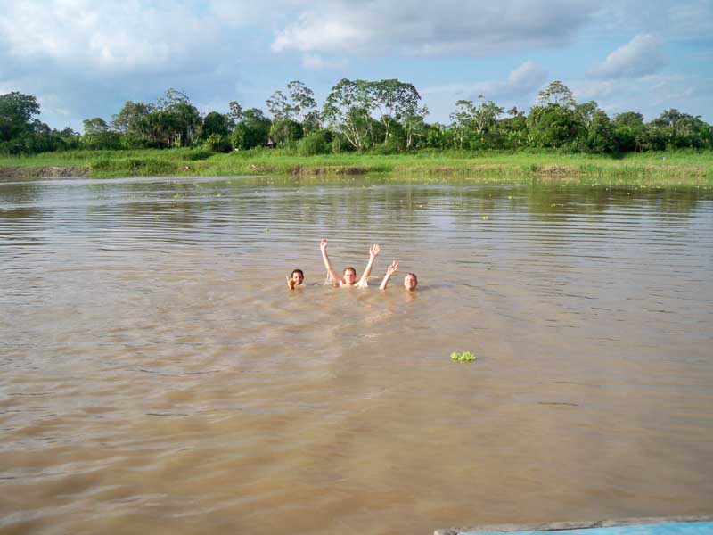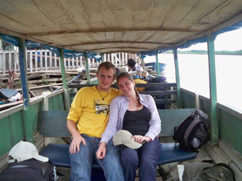 Der vierte Tag bzw. die Nacht waren für mich nicht so toll. Irgendetwas hatte mich am Tag zuvor beim Wandern oder Schwimmen gebissen, gestochen oder ich habe etwas verschluckt. Konnte man hinterher nicht mehr sagen. Auf jeden Fall hatte ich in der Nacht Magen – Darmbeschwerden , Kopfschmerzen, Schwindel und Fieber. Zum Glück hatten wir den Arzt dabei, der mir zur Sicherheit ein Breitbandantibiotikum gegeben hat, weil eben keiner wusste was das war. Ich bin den vierten Tag also erstmal im Bett geblieben während Tobi und der andere Argentinier sich das Nachbardorf angesehen haben. Danach war für etwa 11.00 die Abfahrt nach Iquitos geplant. Ich habe die 5 Stunden Rückfahrt liegend im Boot und dank meinem Magen auch ohne Essen und Trinken verbracht. Dem entsprechend war ich auch sehr wackelig auf den Beinen als wir dann angekommen sind. Tobi und eine fremde Frau haben mich dann aus dem Boot gehieft und auf einen Hocker an den Straßenrad gesetzt. Ich selbst habe dank dem Fieber kaum etwas mitbekommen aber ich muss wohl doch sehr krank ausgesehen haben, denn aufeinmal stand das halbe Dorf um mich herrum: Dies meisten haben mir den Kopf getätschelt, die Hände auf meine Hände und Schultern gelegt, haben mir auf Rücken, Stirn und unter die Nase irgendwelche Salben geschmiert und mich mit Ketten und Armbändern behangen. Tobi hat mir hinterher erzählt, dass die sich darüber unterhalten haben, was ich wohl habe und von Dengue über Gelbfieber bis hin zu Schlangenbissen war alles dabei und mich schon für fast tod erklärt. Der Arzt kam dann aber in etwa zur gleichen Zeit, wie die Salben und Ketten, mit Elektrolyten wieder. Etwa eine halbe Stunde später ging es mir wesentlich besser und am Abend war ich nur noch schlapp. Ob das nun an Salben, Ketten oder Elktolyten lag sei mal dahin gestellt, aber zu sehen wieviel diese Menschen alle zu geben haben, obwohl kaum etwas besitzen war schon unglaublich…