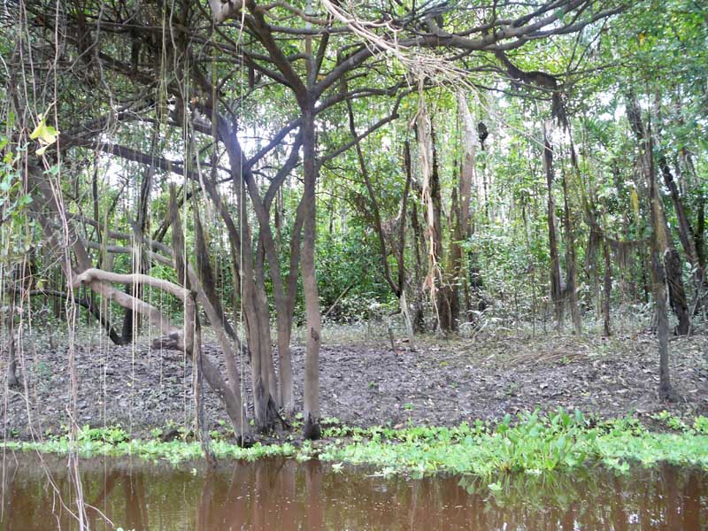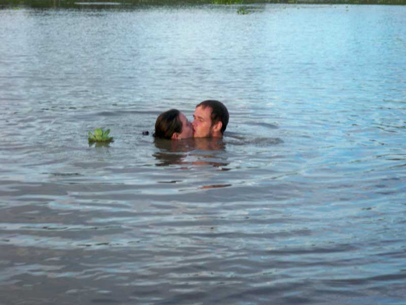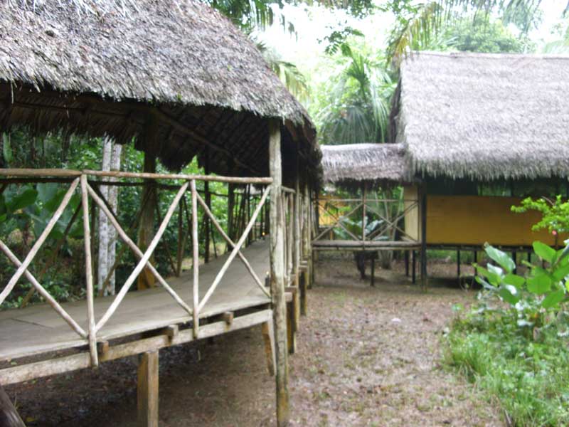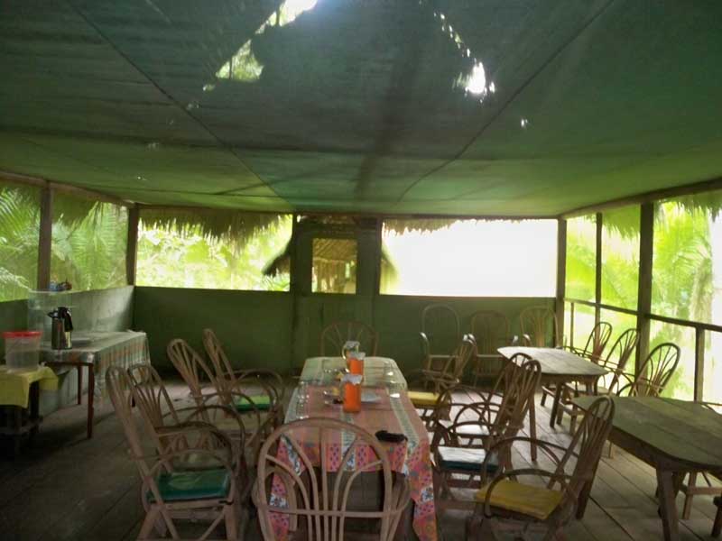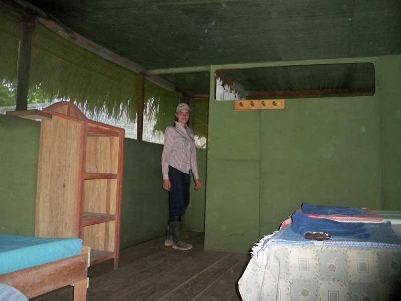 Um das einmal genauer zu erklären: Tobi und ich sind mit einem weiterem Besucher (ein Argentinier) in eine Lodge gefahren. Es gibt reltiv luxuriöse (fast) Hotels, wir haben uns aber mehr für den Abenteuerurlaub entschieden. Das heißt: kein warm Wasser und kein Strom, auch hatten wir keine festen Wände. Das war eine sehr kleine Anlage, die auf Pfählen gebaut war, damit Schlangen und Spinnen einem möglichst nicht über den Weg kriechen. Da diese sich aber nur bedingt von Treppen abhalten lassen, war das wohl eher für die Besucher, damit die sich zumindest etwas sicherer fühlen. Auf den Pfählen gab es mehrere kleine Räume, jeweils für 2 bis 4 Personen. In jedem Raum gab es eine Dusche ( aufbereitets Regenwasser), eine Toilete, ein Waschbecken, eine Hängematte, Betten, ein Regal und eine Ölleuchte. Die Zimmer hatten als Wände und Dach Fliegengitter. Das heißt, man hat alles gehört und gesehen, also Nachts die Glühwürmchen vorm Fenster und eine unglaublich schöne Geräuschkulisse (wenn zu anfang auch etwas unheimlich). Abends haben wir den Raum mit seiner Öllampe abgesucht um zusehen, ob irgendwelche giftigen Tiere in die Wohnung gekommen sind, was hier und da auch mal vorkam (Spinnen). Auch kam es vor, dass man mit Gekos geduscht hat, wenn diese gereade über einem über das Fliegengritter liefen. Aber unglaublich schön 🙂