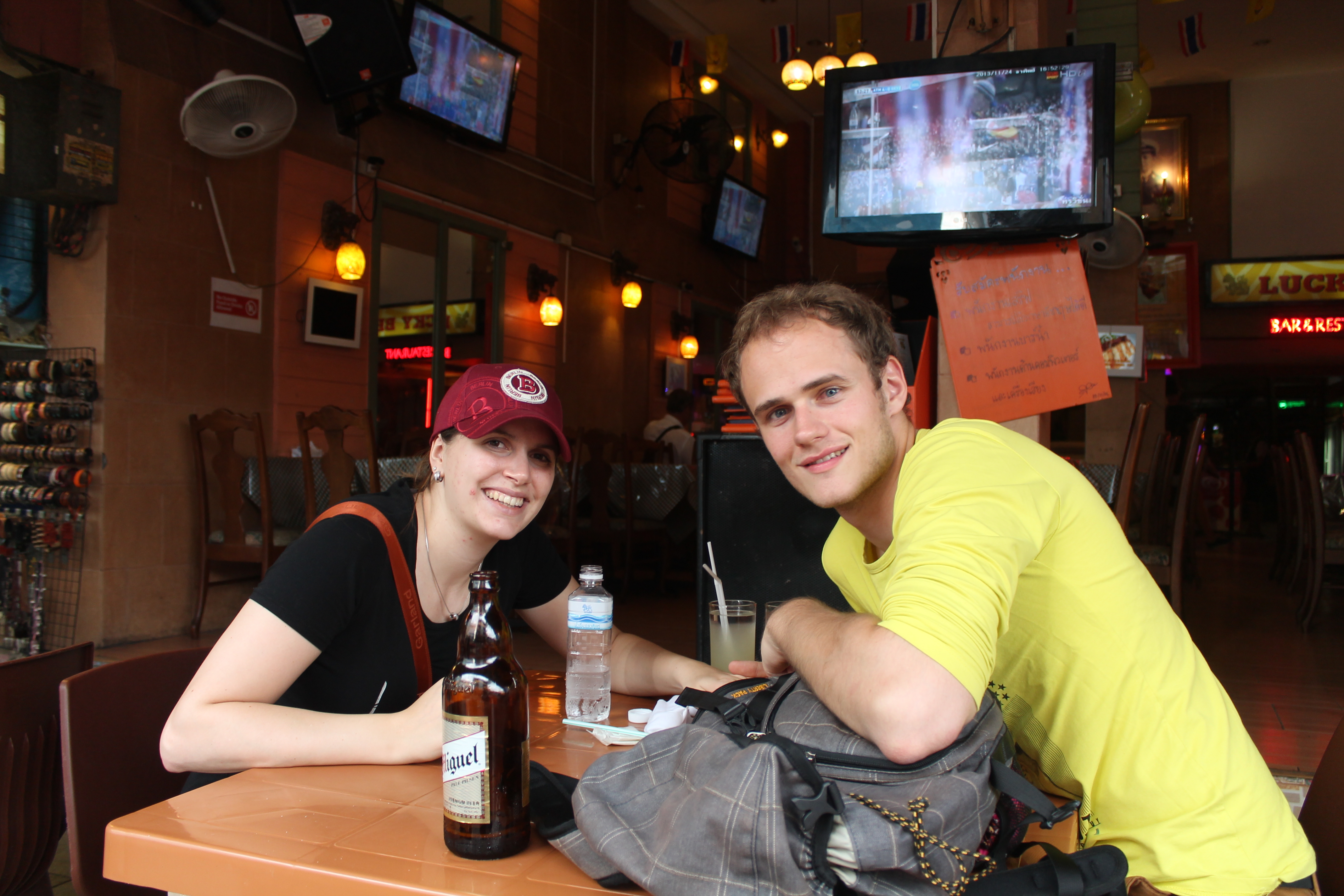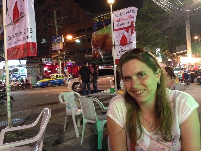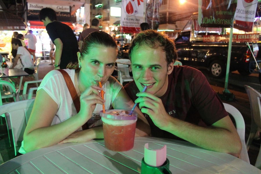 Zuerst haben wir im hektischen Bangkok begonnen und den Anfang der Proteste miterlebt. Im Gegensatz zu dem, was wir in den Nachrichten gelesen hatten, war es wirklich alles sehr ruhig. Diese mussten wir durchqueren als wir zur Khao San Road wollten, eine der bekanntesten Straßen für Backpacker. Hier gibt es alles: gegrillte Würmer und Skorpione, gefälschte Ausweise aller Art, Massagen, Mitbringsel und sehr viele Schneider. Natürlich haben wir uns alles angesehen und uns massieren lassen 😀 Außerdem waren hier auch am ersten Abend essen. Durch Zufall haben wir ein tolles lokal in einem Hinterhof gefunden, nachdem wir durch diverse Seitenstraßen gestreift waren. Hier habe ich das beste Hähnchen in ganz Thailand gegessen (aber das wusste ich zu dem Zeitpunkt natürlich noch nicht 😉 )